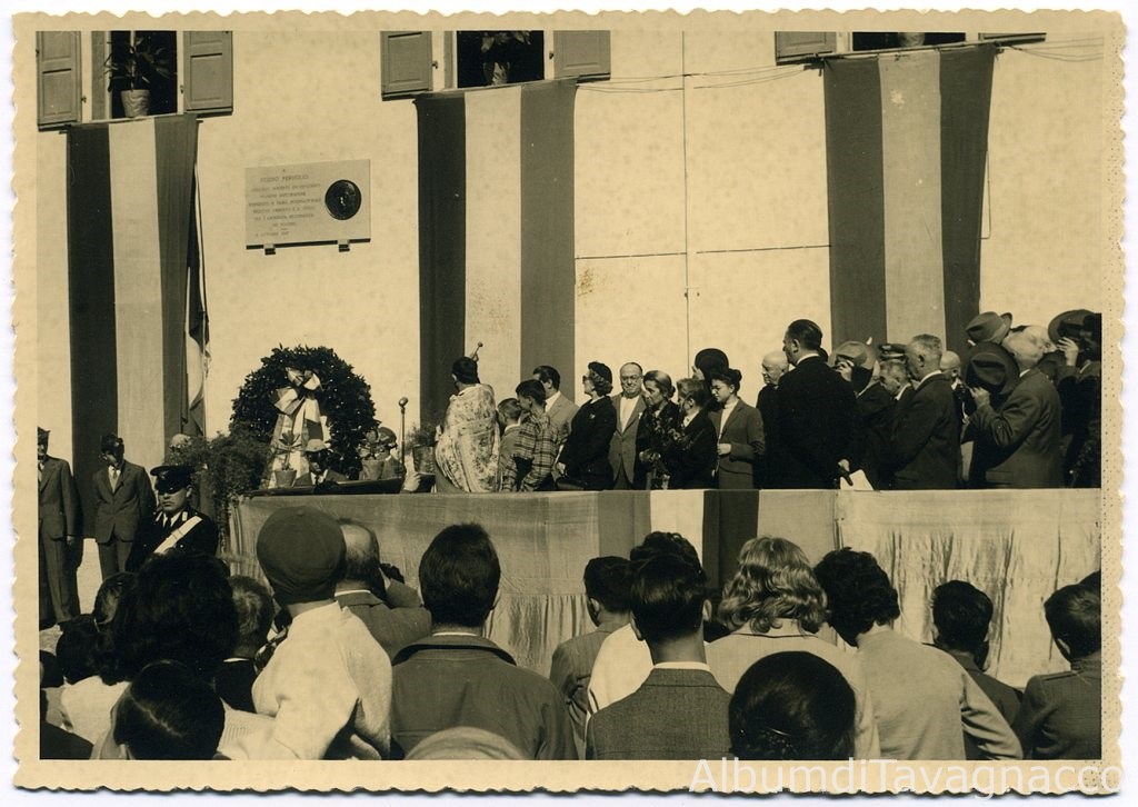 Terzo anniversario della morte del geologo Egidio Feruglio. Il parroco di Feletto, Don Nicolò Rossi, benedice la lapide commemorativa affissa sulla facciata di casa Feruglio, dal palco delle personalità, in Piazza Santa Caterina.