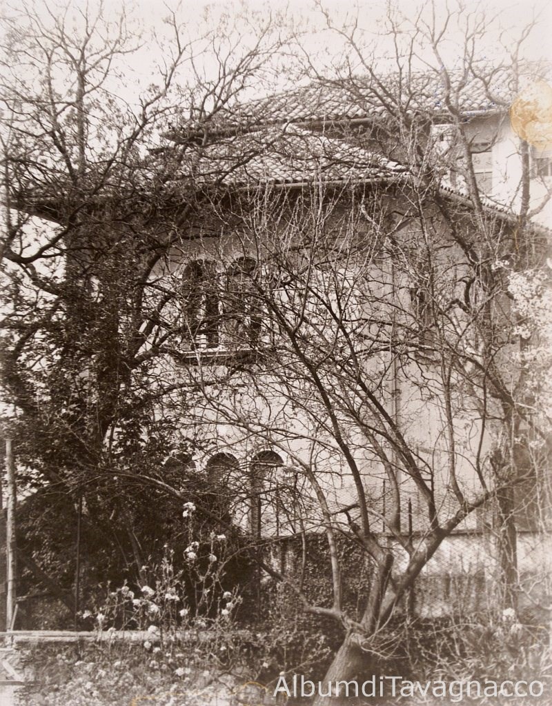 Il vecchio asilo di Tavagnacco, intravisto tra i rami di alberi e piante antistanti.