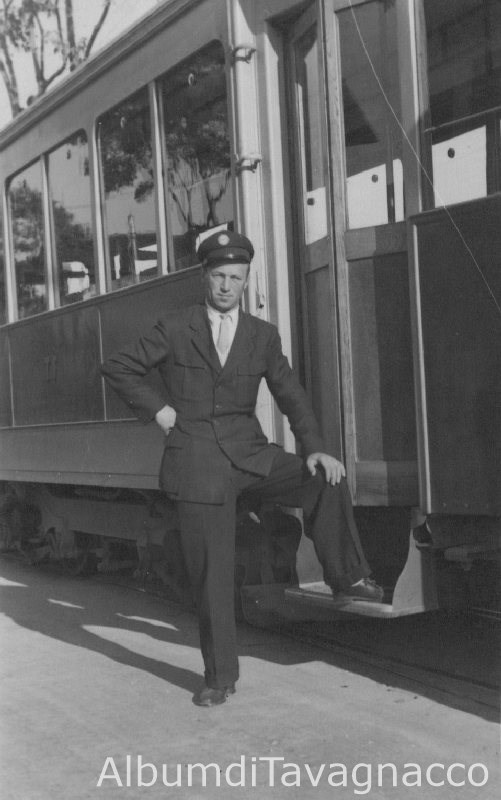Il tranviere Vittorio Querini in posa vicino al tram.