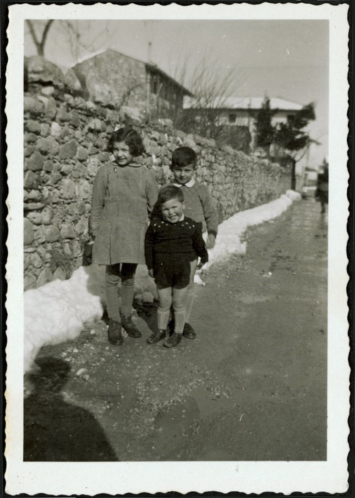 Tre bambini in posa vicino a un muro di pietra, in Via Cincinnato. Al centro: Walter Foschiatti, all'età apparente di ca. 3 anni.