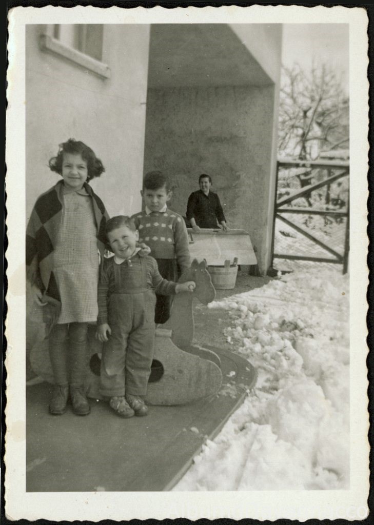 Gruppo di tre bambini in posa vicino a un cavallo a dondolo e ai margini del cortile innevato di casa Foschiatti, con una donna sullo sfondo che sta dietro a un lavatoio in legno.