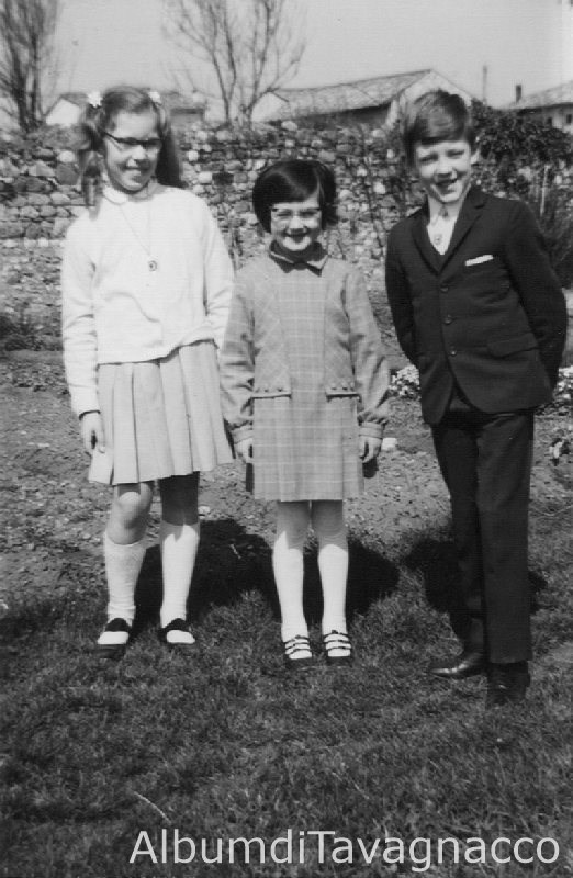 Tre bambini (Sandra, Rosella, Rodolfo) in posa nell'orto.
