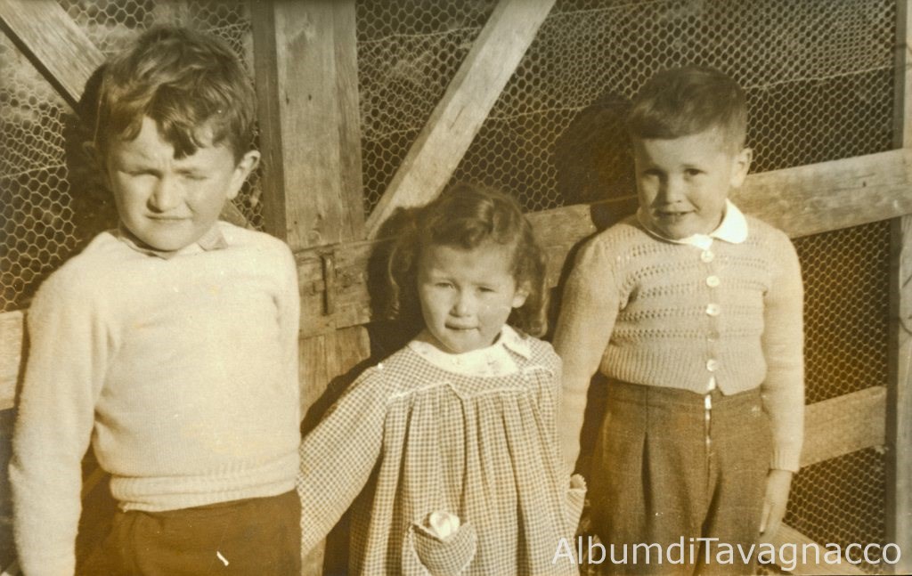 Primo piano di tre bambini in posa davanti al cancello del cortile di casa Foschiatti.