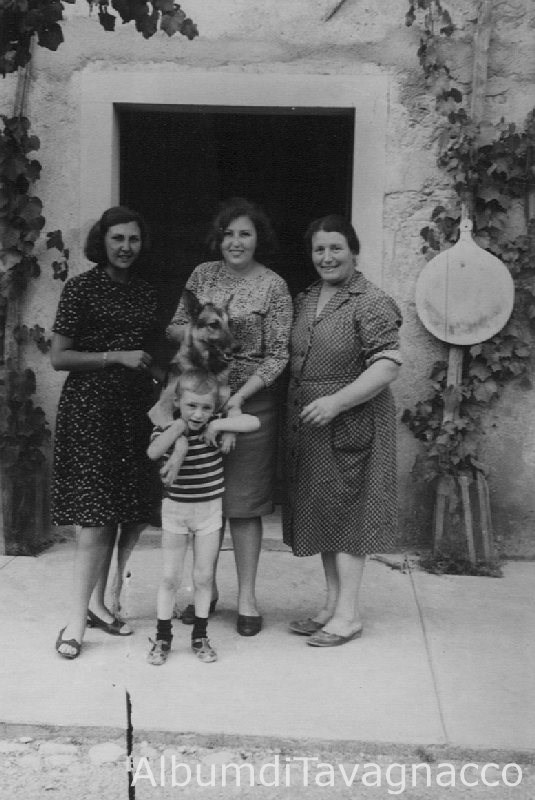 Tre donne, un bambino e il cane "Dik", in posa nel cortile dell'azienda agricola dei F.lli Tonutti.