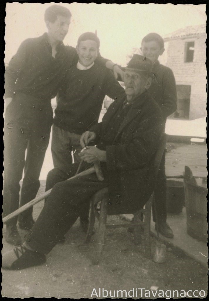 Tre ragazzi in posa insieme a un uomo anziano, nel cortile Foschiatti (Mantue).