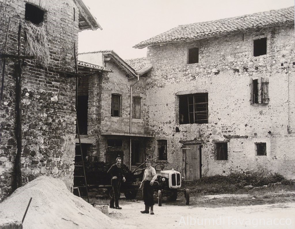 Due uomini in posa vicino al trattore nella ‘Cort dai Nônos’, presso Via Matteotti.