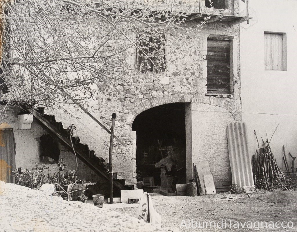 Casa in pietra con portale parzialmente murato e scala esterna in legno.