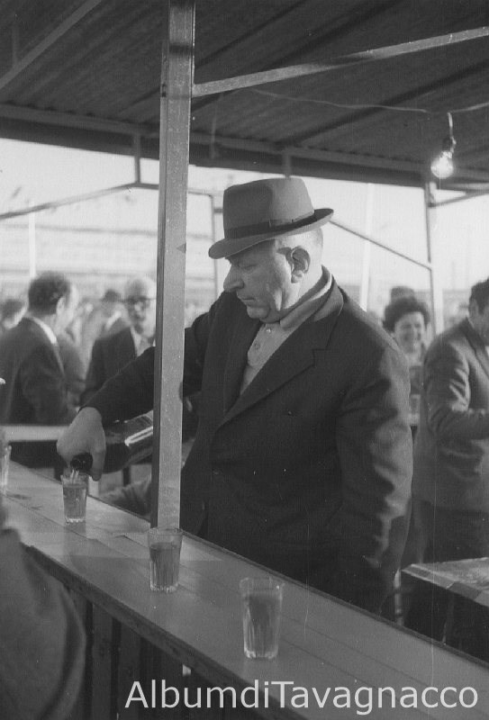 Ritratto di un uomo che si versa da bere del vino, nel chiosco della sagra del 1¦ maggio.