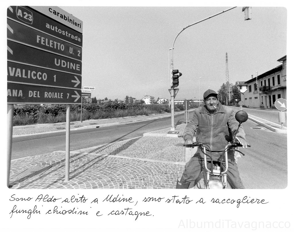 Uomo: anziano. - Motocicletta. - Via Molin Nuovo. - Aiuola spartitraffico. - Semaforo. - Trattoria: Sguazzi. - Case. - Insegne