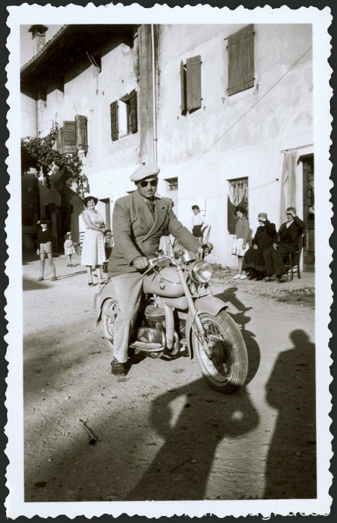 Ritratto di un uomo in posa sulla sella di una motocicletta, nel cortile di casa Foschiatti.