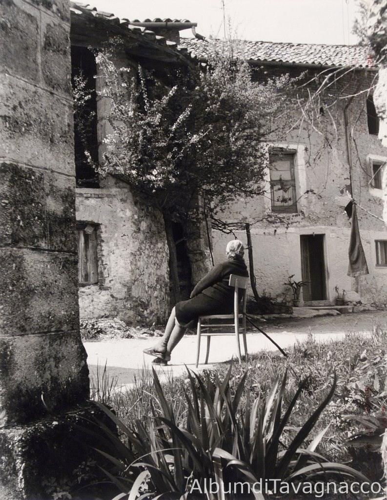 Donna anziana seduta su una sedia, in un vicolo di Tavagnacco.