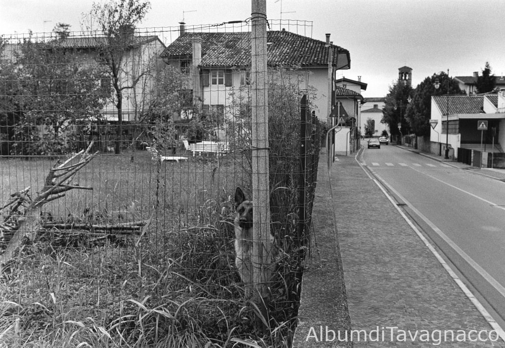 Via C. Battisti. - Recinzione. - Giardino. - Alberi. - Campanile