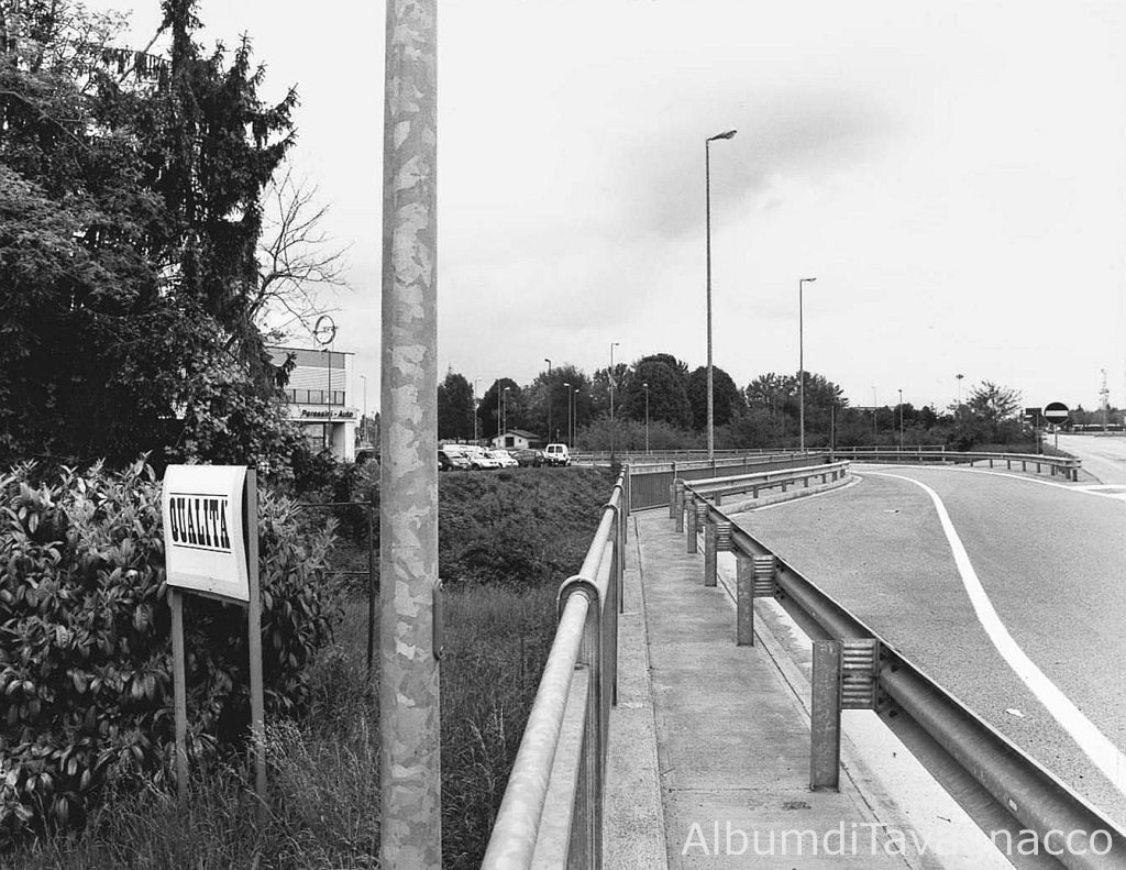 Via Nazionale. - Incrocio. - Cartello. - Via A. Palladio. - Pali della luce. - Barriere stradali. - Autoconcessionaria: Opel. - Alberi