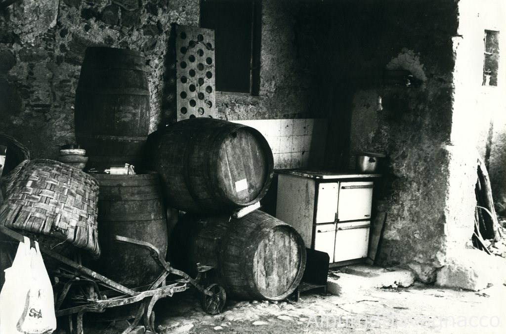 Un aratro, delle botti per il vino,una cucina economica ed altri oggetti ricoverati in un sottoportico.