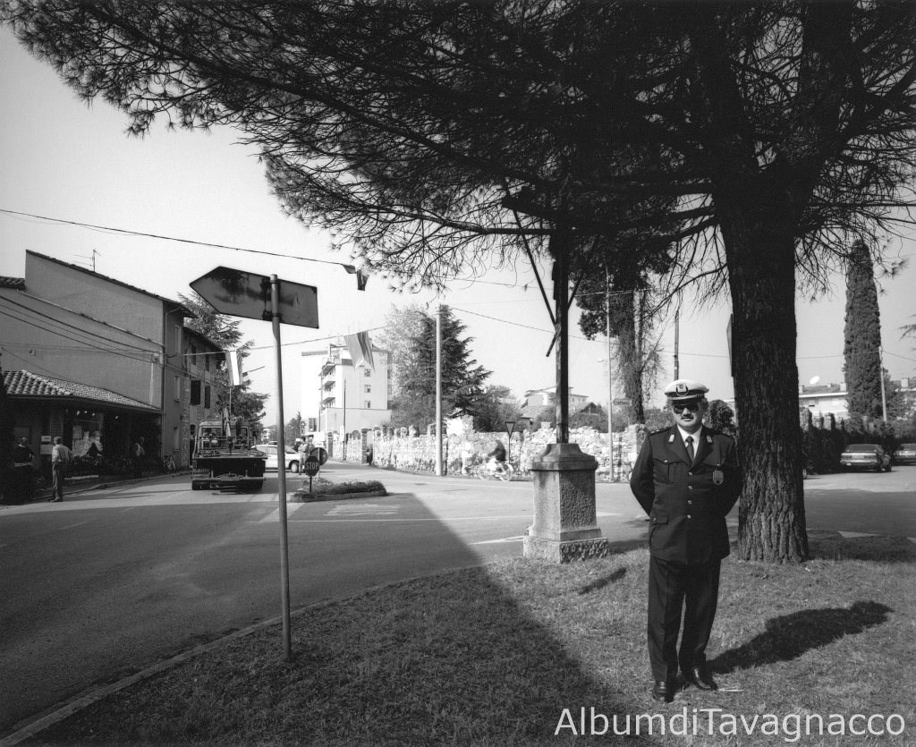 Vigile urbano. - Aiuola. - Alberi. - Viale IV Novembre. - Via P. Micca. - Cartello stradale. - Muretto. - Case. - Palazzina. - Crocefisso