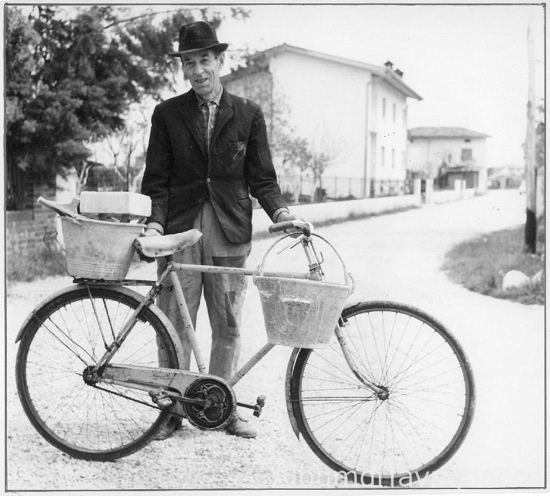 Ritratto di "Viji Muradòr di Mulin Gn¨f", in posa con la bicicletta e alcuni attrezzi.